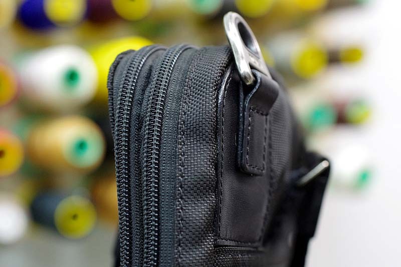 この仕様のモデルは引っ張られる付け根部分が、革の土台と一緒に本体のバリスティックナイロンに縫製されているので、引っ張られて部分的に裂けるという補修はほとんどありませんが、その代わり金具を連結している革のベルト部分で裂けてしまうという補修はしばしばあります(これは経年劣化なので致し方ないかと)