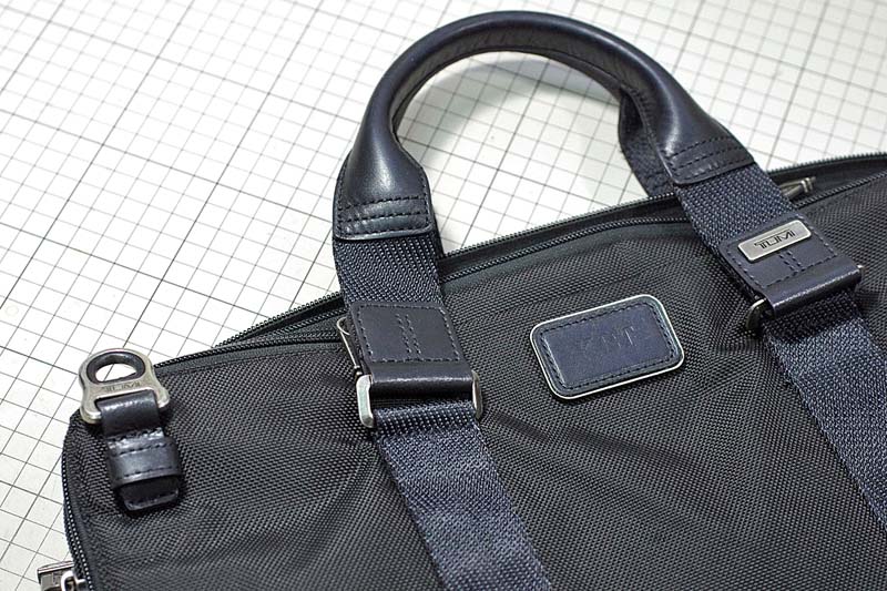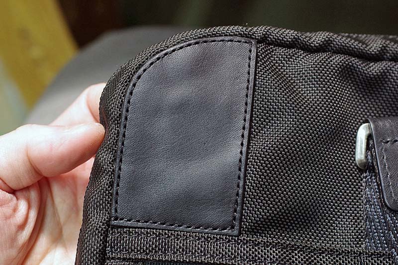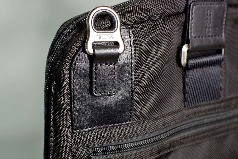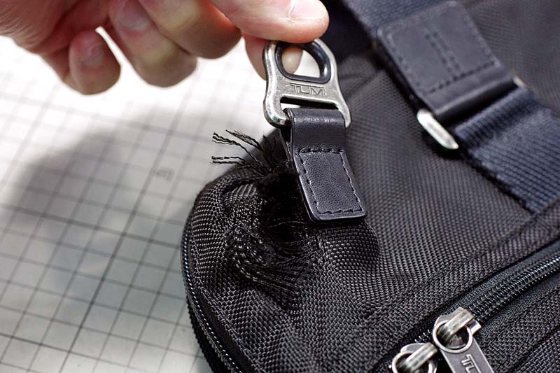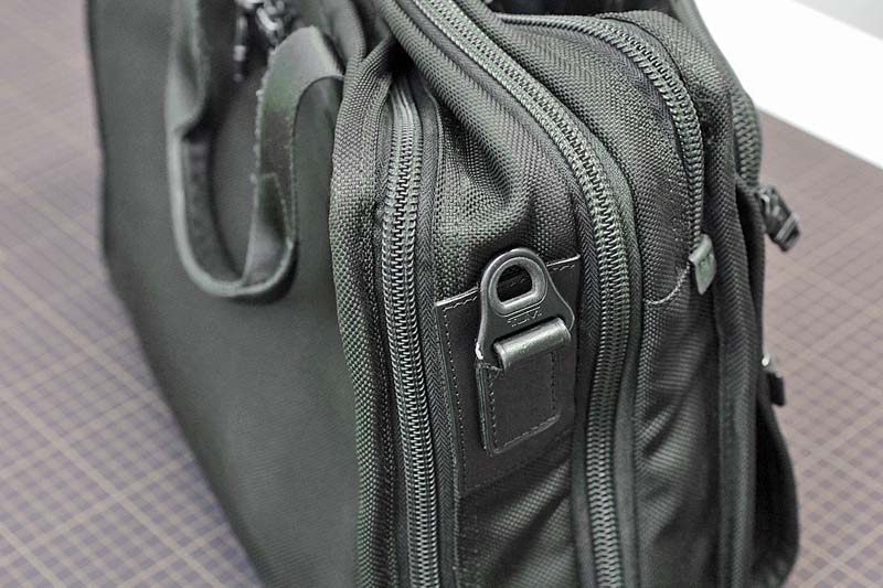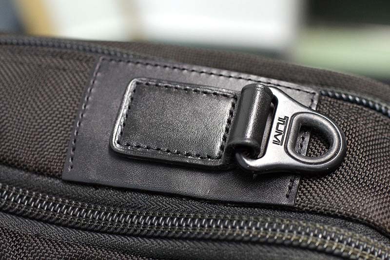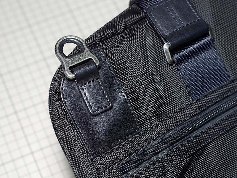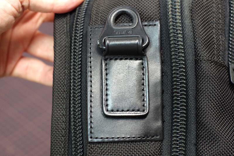 下の画像はTUMIの別のモデル。こちらのモデルは金具が固定されている部分は根本が革で覆われ本体のバリスティックナイロンに縫製されています。