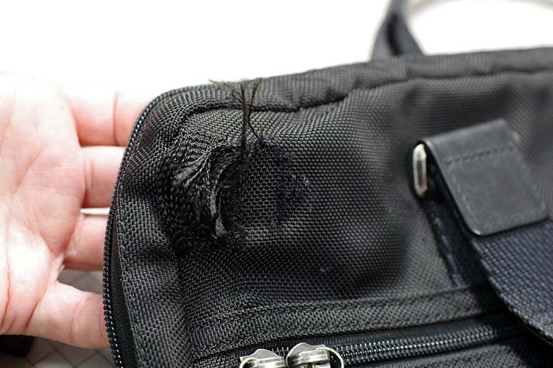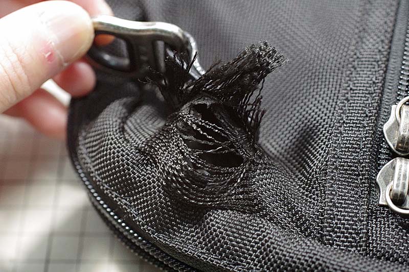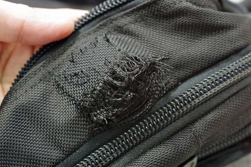 裂けてしまうと編まれていたナイロンがボサボサとどんどん拡大・・・。バリスティックナイロンは裏面に伸び止め加工が施されていないと一旦裂け始めてしまうと広がり易いのかもしれません。