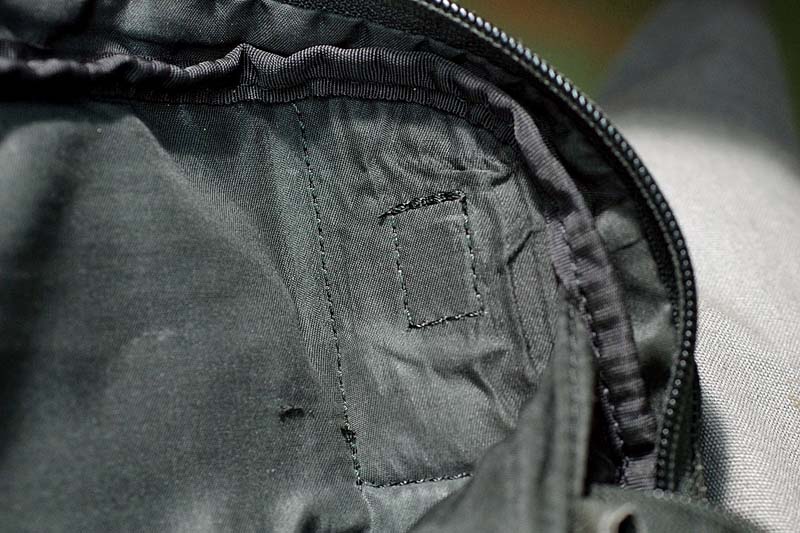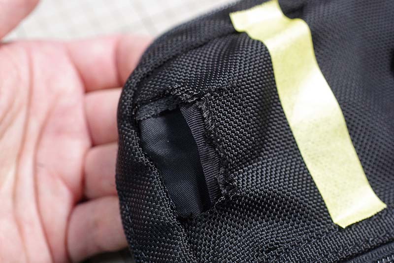 ボサボサをカットしました。ちらっと補強のナイロンが見えています。このモデルも付け根パーツの四角い縫製箇所の補強はしてありますが、外装のバリスティックナイロンが引っ張られる負荷の補強にはこれではなっていません。