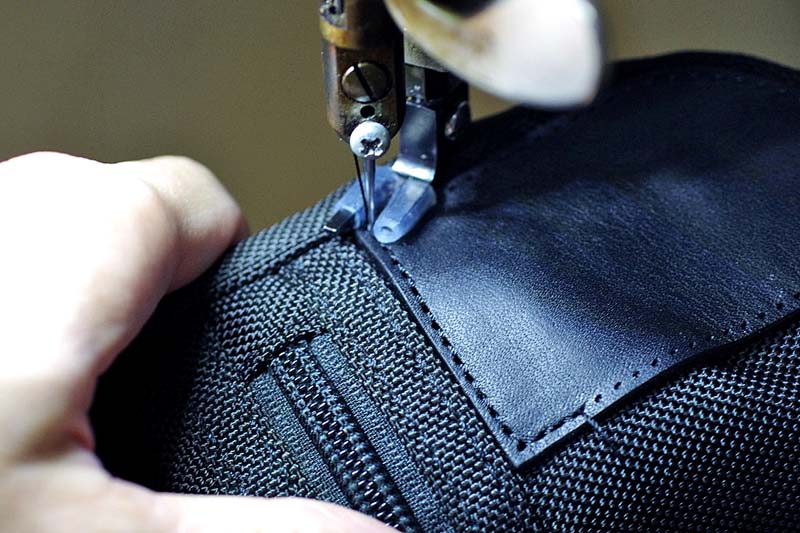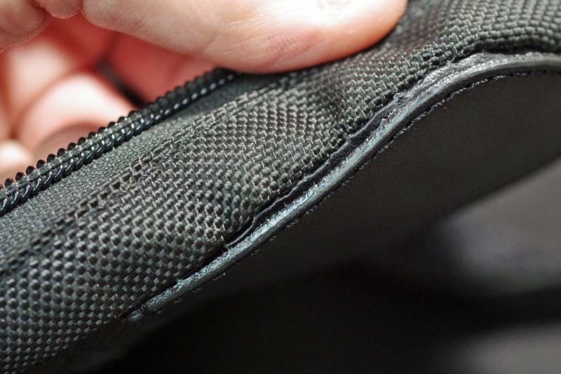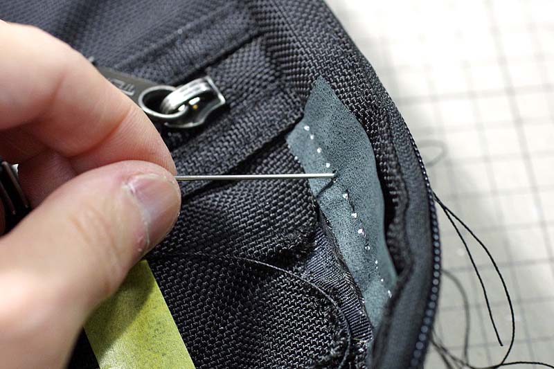 まずはほつれが始まっているエッジ部分を帯革で処置します。縫いたい部分のキワの谷の内装側は、内装生地とバリスティックナイロンなどをまとめたパイピングがあり、ミシンで縫製するとパイピングが邪魔をして縫い目がぐだぐだになりそうなので手縫いでちくちくします。