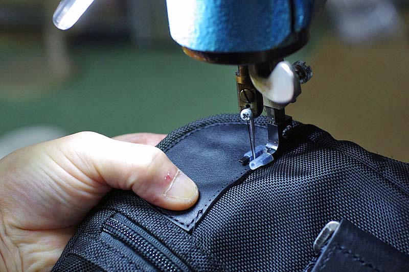 土台の補強が終わればあとはオリジナルの金具固定パーツを縫製します。これでストラップで引っ張られても本体の表面のバリスティックナイロンのみが局所的に引っ張られることがなく、面で耐えられるようになります。