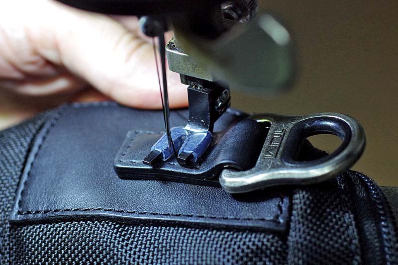 内装生地、バリスティックナイロン、革の土台、金具固定パーツをまとめて貫通し縫製しているので厚みがあり縫製は難しくなりますが、強度MAXです。