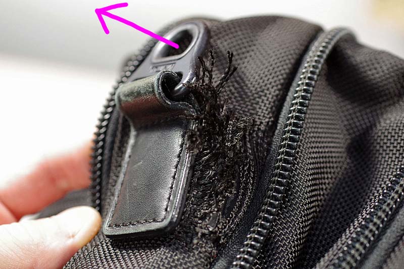 ストラップを引っ掛ける金具のレザーパーツの脇が定番で裂けてしまうようです。裂けるのは決まって片側。考えられる理由は赤矢印方向にストラップで常時引っ張られる事でバリスティックナイロンが耐えきれずに裂けてしまうのだろうと。