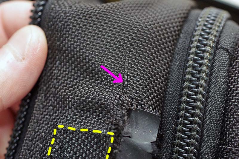 伸び止め加工がされていない場合、編み込まれたナイロン糸は1箇所がほつれ始めると簡単にほつれが拡大してしまいます。下の画像は裂けてボサボサにほつれた繊維はカットし除いた状態。黄色の点線が付け根パーツが縫製されていた部分。画像ではわかりにくいのですが、赤矢印部分まで糸が縦に抜けてしまっています。